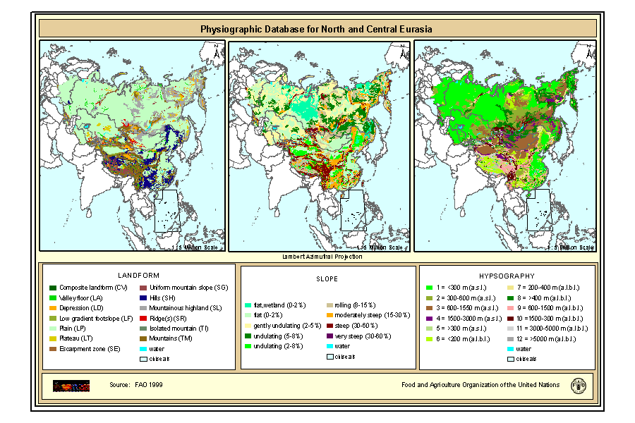 - The maps are included in the SOIL and TERRAIN Database for Northern and Central EURASIA CD-ROM , which contains also the Soil map of North and Central Eurasia, reports and databases. Copies of this CD-Rom can be ordered from: Sales and Marketing Group FAO, Viale delle Terme di Caracalla, 00153 Rome, or by email to Publications-sales@fao.org. The terms and definitions used in the Physiographic database are based on the procedures manual for ?Global and National Soils and Terrain Digital Databases (SOTER)?, prepared by UNEP, ISSS, ISRIC and FAO and published by FAO as World Soil Resources Report #74 Rev1 (1995). Refinements were made in China as part of the preparation of a physiographic map for Asia, work carried out by G. van Lynden for FAO as part of the ASSOD project.