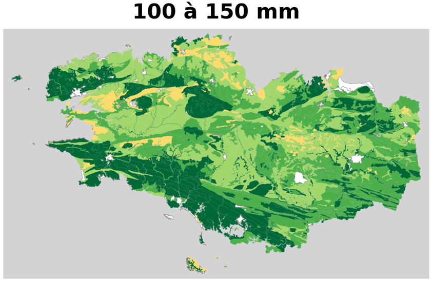 Le Réservoir en eau Utilisable Maximal des sols a été estimé pour la région Bretagne à partir du Référentiel Régional Pédologique, dans la limite maximale de 1 mètre d’épaisseur du sol. Cette thématisation a été réalisée avec des fonctions de pédotransfert, en suivant la méthode détaillée dans le guide RU aux éditions Arvalis (Bouthier et al., 2022). La représentativité des classes de RUM par UCS, de 0 à 100 % (pourcentage d'occurrence), est cartographiée pour chaque classe de RUM, correspondant aux différents champs : Classe 1 : RUM compris entre 0 et 50 mm Classe 2 : RUM compris entre 50 et 100 mm Classe 3 : RUM compris entre 100 et 150 mm Classe 4 : RUM compris entre 150 et 200 mm Classe 5 : RUM compris entre 200 et 500 mm