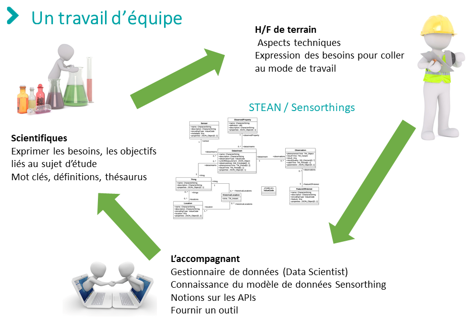 Maintenant que les Things, les Features of Interest, les Sensors et les Observed Properties sont définis, comment configurer une instance STEAN ? C’est ici que le Data Scientist intervient. Il doit fournir les outils et les formalismes pour accompagner le scientifique et le personnel de terrain dans l’intégration de leurs données vers le modèle de données SensorThings.